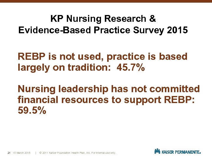 KP Nursing Research & Evidence-Based Practice Survey 2015 REBP is not used, practice is based largely on tradition: 45. 7% Nursing leadership has not committed financial resources to support REBP: 59. 5% 21 15 March 2018 | © 2011 Kaiser Foundation Health Plan, Inc. For internal use only.