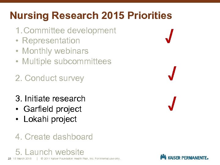 Nursing Research 2015 Priorities 1. Committee development • Representation • Monthly webinars • Multiple subcommittees 2. Conduct survey 3. Initiate research • Garfield project • Lokahi project 4. Create dashboard 5. Launch website 24 15 March 2018 | © 2011 Kaiser Foundation Health Plan, Inc. For internal use only. √ √