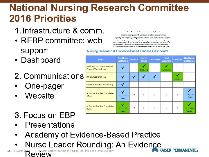 National Nursing Research Committee 2016 Priorities 1. Infrastructure & community • REBP committee; webinars; regional support • Dashboard 2. Communications • One-pager • Website 3. Focus on EBP • Presentations • Academy of Evidence-Based Practice • Nurse Leader Rounding: An Evidence 28 15 March 2018 | © 2011 Kaiser Foundation Health Plan, Inc. For internal use only.