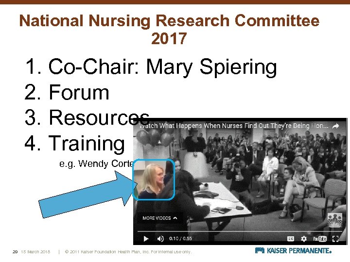 National Nursing Research Committee 2017 1. Co-Chair: Mary Spiering 2. Forum 3. Resources 4. Training e. g. Wendy Cortez 29 15 March 2018 | © 2011 Kaiser Foundation Health Plan, Inc. For internal use only.