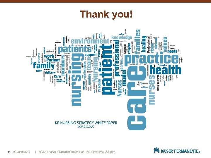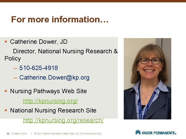 For more information… § Catherine Dower, JD Director, National Nursing Research & Policy – 510 -625 -4918 – Catherine. Dower@kp. org § Nursing Pathways Web Site http: //kpnursing. org/ § National Nursing Research Site http: //kpnursing. org/research/ 32 15 March 2018 | © 2011 Kaiser Foundation Health Plan, Inc. For internal use only.