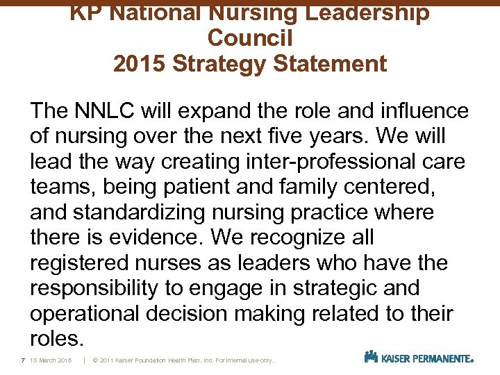 NNLC Committees & Foundational Areas 1. Quality & Safety 2. Professional Development 3. Professional Practice 4. Leadership Development 5. Clinical Informatics & Technology 6. Research & Evidence Based Practice 7. Workforce Strategy 6 15 March 2018 | © 2011 Kaiser Foundation Health Plan, Inc. For internal use only.