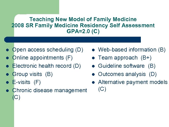 Teaching New Model of Family Medicine 2008 SR Family Medicine Residency Self Assessment GPA=2. 0 (C) l l l Open access scheduling (D) Online appointments (F) Electronic health record (D) Group visits (B) E-visits (F) Chronic disease management (C) l l l Web-based information (B) Team approach (B+) Guideline software (B) Outcomes analysis (D) Alternative payment models (C)