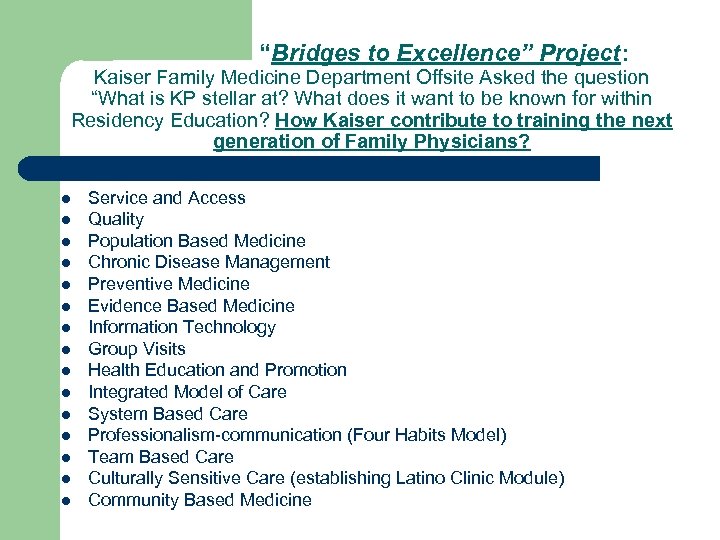“Bridges to Excellence” Project: Kaiser Family Medicine Department Offsite Asked the question “What is KP stellar at? What does it want to be known for within Residency Education? How Kaiser contribute to training the next generation of Family Physicians? l l l l Service and Access Quality Population Based Medicine Chronic Disease Management Preventive Medicine Evidence Based Medicine Information Technology Group Visits Health Education and Promotion Integrated Model of Care System Based Care Professionalism-communication (Four Habits Model) Team Based Care Culturally Sensitive Care (establishing Latino Clinic Module) Community Based Medicine
