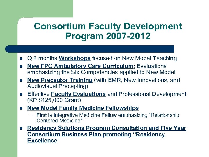 Consortium Faculty Development Program 2007 -2012 l l l Q 6 months Workshops focused on New Model Teaching New FPC Ambulatory Care Curriculum; Evaluations emphasizing the Six Competencies applied to New Model New Preceptor Training (with EMR, New Innovations, and Audiovisual Precepting) Effective Faculty Evaluations and Professional Development (KP $125, 000 Grant) New Model Family Medicine Fellowships – l First is Integrative Medicine Fellow emphasizing “Relationship Centered Medicine” Residency Solutions Program Consultation and Five Year Consortium Business Plan promoting “Residency Excellence”