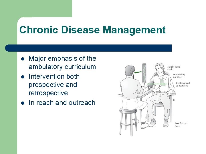 Chronic Disease Management l l l Major emphasis of the ambulatory curriculum Intervention both prospective and retrospective In reach and outreach