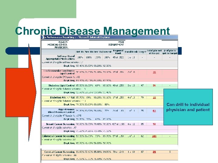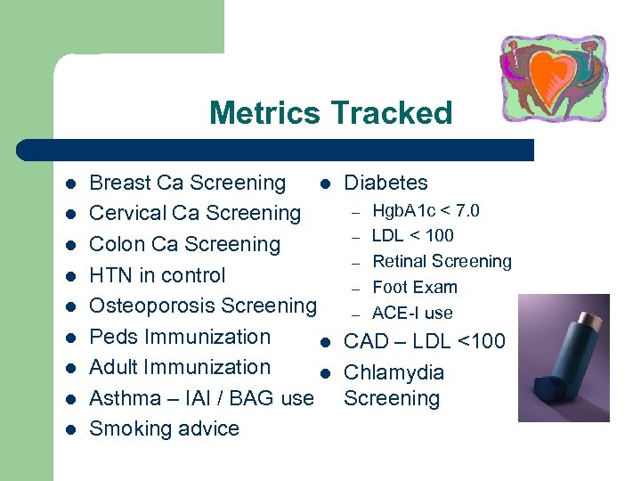 Metrics Tracked l l l l l Breast Ca Screening l Cervical Ca Screening Colon Ca Screening HTN in control Osteoporosis Screening Peds Immunization l Adult Immunization l Asthma – IAI / BAG use Smoking advice Diabetes – – – Hgb. A 1 c < 7. 0 LDL < 100 Retinal Screening Foot Exam ACE-I use CAD – LDL <100 Chlamydia Screening