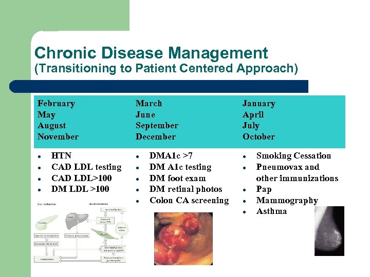 Chronic Disease Management (Transitioning to Patient Centered Approach) February May August November HTN CAD LDL testing CAD LDL>100 DM LDL >100 March June September December DMA 1 c >7 DM A 1 c testing DM foot exam DM retinal photos Colon CA screening January April July October Smoking Cessation Pneumovax and other immunizations Pap Mammography Asthma
