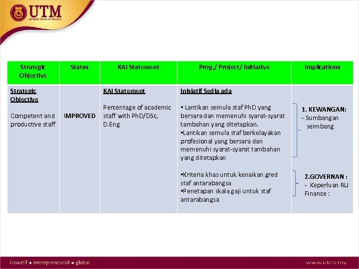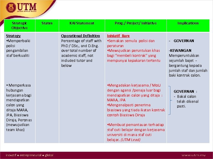 Strategic Objective Strategy • Memperbaiki polisi pengambilan staf berkualiti • Memperkasa hubungan kerjasama bagi mendapatkan calon yang ditaja MARA, JPA, Biasiswa Diraja, Peronas (mewujudkan team khas) Status KAI Statement Operational Definition Percentage of staff with Ph. D / DSc. , and D. Eng. over total number of academic staff, not included tutor and below Prog. / Project/ Initiative Inisiatif Baru • Semakan semula polisi dan peraturan • Mewujudkan peruntukan khas bagi “membeli kontrak” yang mempunyai kepakaran tertentu • Mengadakan kerjasama / Mo. U dengan agensi /penaja luar bagi mendapatkan calon yang ditaja : MARA, JPA • Mengenalpasti penerima biasiswa yang tiada ikatan kontrak contoh Biasiswa Diraja • Membuat pemantauan terhadap staf cuti belajar dengan kerjasama universiti di mana staf cuti belajar. (UTM Lead) Implications - GOVERNAN -KEWANGAN Memperuntukkan sejumlah bajet bergantung kepada jumlah staf dan jumlah baki kontrak calon. GOVERNAN : - Bakal calon telah dikenal pasti.