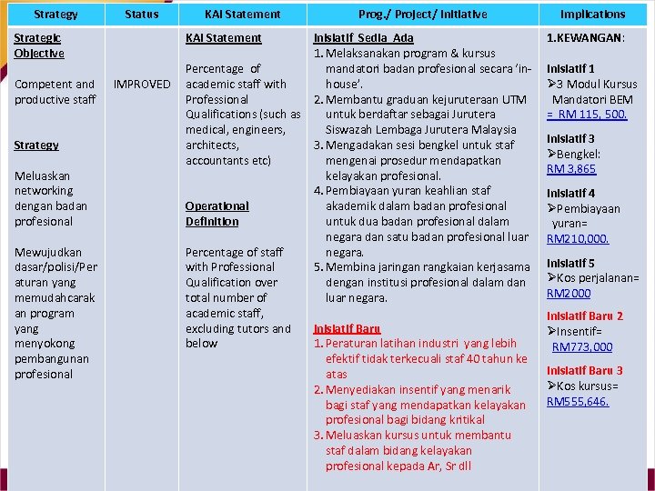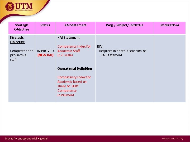Strategic Objective Status Strategic Objective Competent and IMPROVED productive (NEW KAI) staff KAI Statement Prog. / Project/ Initiative KAI Statement Competency Index for Academic Staff (1 -5 scale) Operational Definition Competency Index for Academic based on study on Staff Competency instrument KIV - Requires in depth discussion on KAI Statement Implications