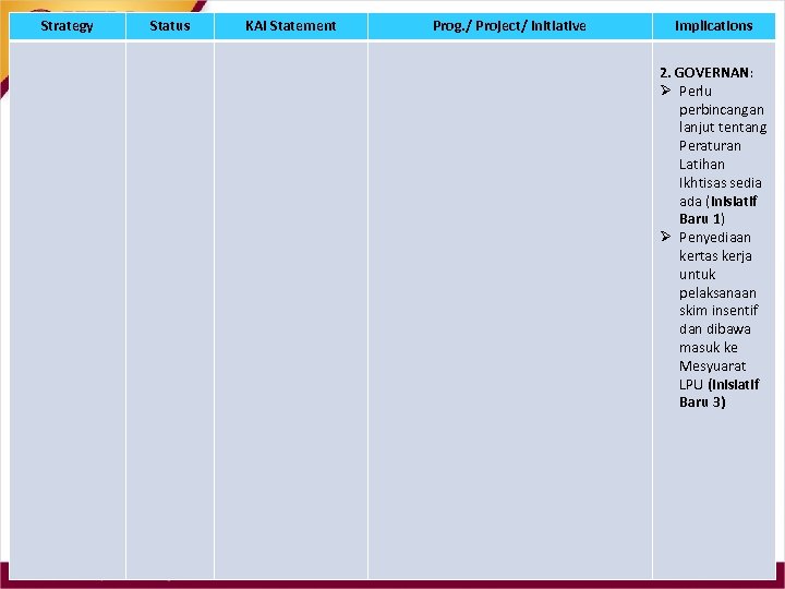 Strategy Status KAI Statement Prog. / Project/ Initiative Implications 2. GOVERNAN: Ø Perlu perbincangan lanjut tentang Peraturan Latihan Ikhtisas sedia ada (Inisiatif Baru 1) Ø Penyediaan kertas kerja untuk pelaksanaan skim insentif dan dibawa masuk ke Mesyuarat LPU (Inisiatif Baru 3)