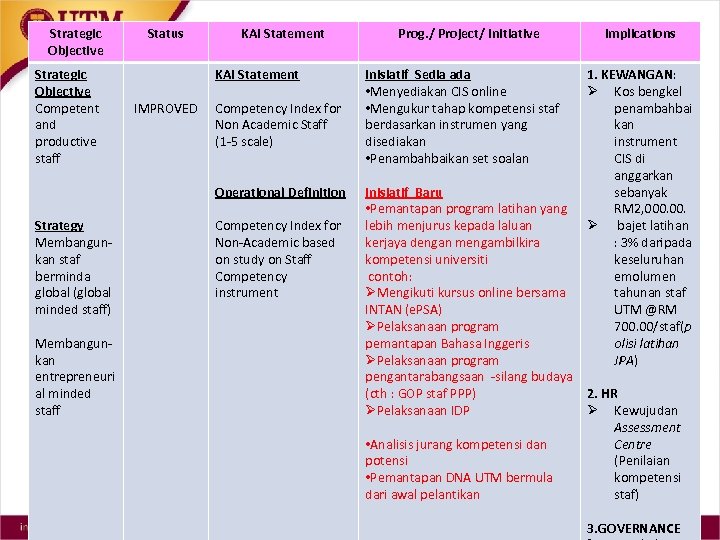 Strategic Objective Competent and productive staff Status KAI Statement IMPROVED Competency Index for Non Academic Staff (1 -5 scale) Operational Definition Strategy Membangunkan staf berminda global (global minded staff) Membangunkan entrepreneuri al minded staff Competency Index for Non-Academic based on study on Staff Competency instrument Prog. / Project/ Initiative Inisiatif Sedia ada • Menyediakan CIS online • Mengukur tahap kompetensi staf berdasarkan instrumen yang disediakan • Penambahbaikan set soalan Inisiatif Baru • Pemantapan program latihan yang lebih menjurus kepada laluan kerjaya dengan mengambilkira kompetensi universiti contoh: ØMengikuti kursus online bersama INTAN (e. PSA) ØPelaksanaan program pemantapan Bahasa Inggeris ØPelaksanaan program pengantarabangsaan -silang budaya (cth : GOP staf PPP) ØPelaksanaan IDP • Analisis jurang kompetensi dan potensi • Pemantapan DNA UTM bermula dari awal pelantikan Implications 1. KEWANGAN: Ø Kos bengkel penambahbai kan instrument CIS di anggarkan sebanyak RM 2, 000. Ø bajet latihan : 3% daripada keseluruhan emolumen tahunan staf UTM @RM 700. 00/staf(p olisi latihan JPA) 2. HR Ø Kewujudan Assessment Centre (Penilaian kompetensi staf) 3. GOVERNANCE