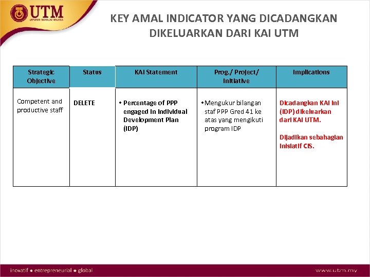 KEY AMAL INDICATOR YANG DICADANGKAN DIKELUARKAN DARI KAI UTM Strategic Objective Competent and productive staff Status DELETE KAI Statement • Percentage of PPP engaged in Individual Development Plan (IDP) Prog. / Project/ Initiative • Mengukur bilangan staf PPP Gred 41 ke atas yang mengikuti program IDP Implications Dicadangkan KAI ini (IDP) dikeluarkan dari KAI UTM. Dijadikan sebahagian inisiatif CIS.