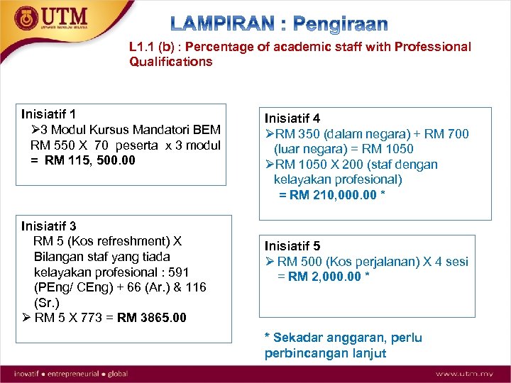 L 1. 1 (b) : Percentage of academic staff with Professional Qualifications Inisiatif 1 Ø 3 Modul Kursus Mandatori BEM RM 550 X 70 peserta x 3 modul = RM 115, 500. 00 Inisiatif 3 RM 5 (Kos refreshment) X Bilangan staf yang tiada kelayakan profesional : 591 (PEng/ CEng) + 66 (Ar. ) & 116 (Sr. ) Ø RM 5 X 773 = RM 3865. 00 Inisiatif 4 ØRM 350 (dalam negara) + RM 700 (luar negara) = RM 1050 ØRM 1050 X 200 (staf dengan kelayakan profesional) = RM 210, 000. 00 * Inisiatif 5 Ø RM 500 (Kos perjalanan) X 4 sesi = RM 2, 000. 00 * * Sekadar anggaran, perlu perbincangan lanjut