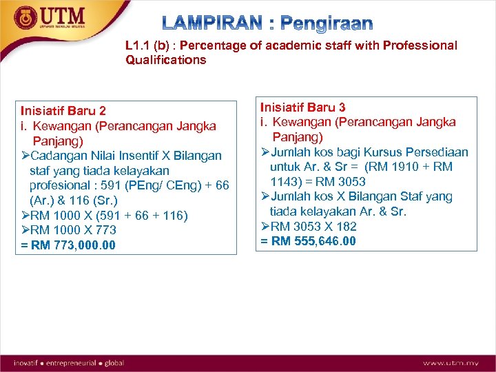 L 1. 1 (b) : Percentage of academic staff with Professional Qualifications Inisiatif Baru 2 i. Kewangan (Perancangan Jangka Panjang) ØCadangan Nilai Insentif X Bilangan staf yang tiada kelayakan profesional : 591 (PEng/ CEng) + 66 (Ar. ) & 116 (Sr. ) ØRM 1000 X (591 + 66 + 116) ØRM 1000 X 773 = RM 773, 000. 00 Inisiatif Baru 3 i. Kewangan (Perancangan Jangka Panjang) ØJumlah kos bagi Kursus Persediaan untuk Ar. & Sr = (RM 1910 + RM 1143) = RM 3053 ØJumlah kos X Bilangan Staf yang tiada kelayakan Ar. & Sr. ØRM 3053 X 182 = RM 555, 646. 00