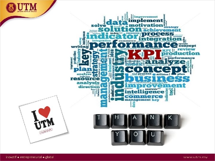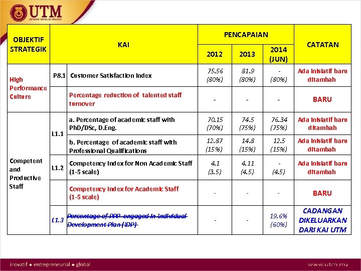 OBJEKTIF STRATEGIK High Performance Culture PENCAPAIAN KAI CATATAN 2012 2013 2014 (JUN) 75. 56 (80%) 81. 9 (80%) Ada inisiatif baru ditambah - - - BARU a. Percentage of academic staff with Ph. D/DSc, D. Eng. 70. 15 (70%) 74. 5 (75%) 76. 34 (75%) Ada inisiatif baru ditambah b. Percentage of academic staff with Professional Qualifications 12. 87 (15%) 14. 8 (15%) 12. 5 (15%) Ada inisiatif baru ditambah 4. 1 (3. 5) 4. 11 (4. 5) Ada inisiatif baru ditambah - - - BARU - 19. 6% (60%) CADANGAN DIKELUARKAN DARI KAI UTM P 8. 1 Customer Satisfaction Index Percentage reduction of talented staff turnover L 1. 1 Competent Competency Index for Non Academic Staff L 1. 2 and (1 -5 scale) Productive Staff Competency Index for Academic Staff (1 -5 scale) Percentage of PPP engaged in Individual L 1. 3 Development Plan (IDP) -