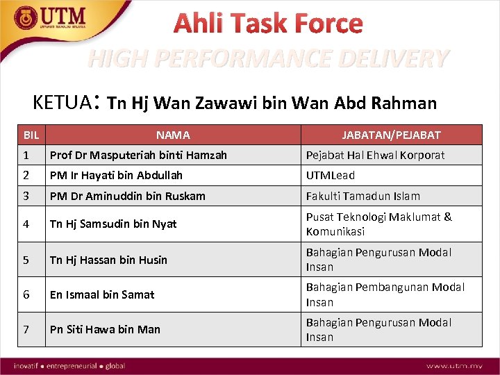 Ahli Task Force HIGH PERFORMANCE DELIVERY KETUA: Tn Hj Wan Zawawi bin Wan Abd Rahman BIL NAMA JABATAN/PEJABAT 1 Prof Dr Masputeriah binti Hamzah Pejabat Hal Ehwal Korporat 2 PM Ir Hayati bin Abdullah UTMLead 3 PM Dr Aminuddin bin Ruskam Fakulti Tamadun Islam 4 Tn Hj Samsudin bin Nyat Pusat Teknologi Maklumat & Komunikasi 5 Tn Hj Hassan bin Husin Bahagian Pengurusan Modal Insan 6 En Ismaal bin Samat Bahagian Pembangunan Modal Insan 7 Pn Siti Hawa bin Man Bahagian Pengurusan Modal Insan