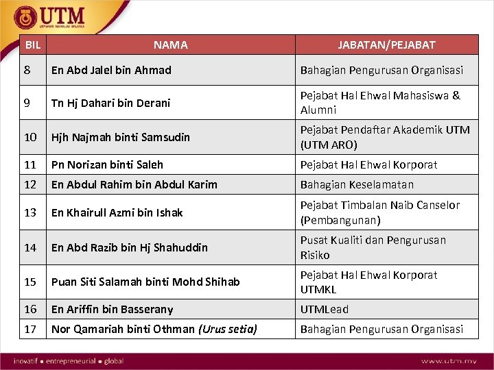BIL NAMA JABATAN/PEJABAT 8 En Abd Jalel bin Ahmad Bahagian Pengurusan Organisasi 9 Tn Hj Dahari bin Derani Pejabat Hal Ehwal Mahasiswa & Alumni 10 Hjh Najmah binti Samsudin Pejabat Pendaftar Akademik UTM (UTM ARO) 11 Pn Norizan binti Saleh Pejabat Hal Ehwal Korporat 12 En Abdul Rahim bin Abdul Karim Bahagian Keselamatan 13 En Khairull Azmi bin Ishak Pejabat Timbalan Naib Canselor (Pembangunan) 14 En Abd Razib bin Hj Shahuddin Pusat Kualiti dan Pengurusan Risiko 15 Puan Siti Salamah binti Mohd Shihab Pejabat Hal Ehwal Korporat UTMKL 16 En Ariffin bin Basserany UTMLead 17 Nor Qamariah binti Othman (Urus setia) Bahagian Pengurusan Organisasi