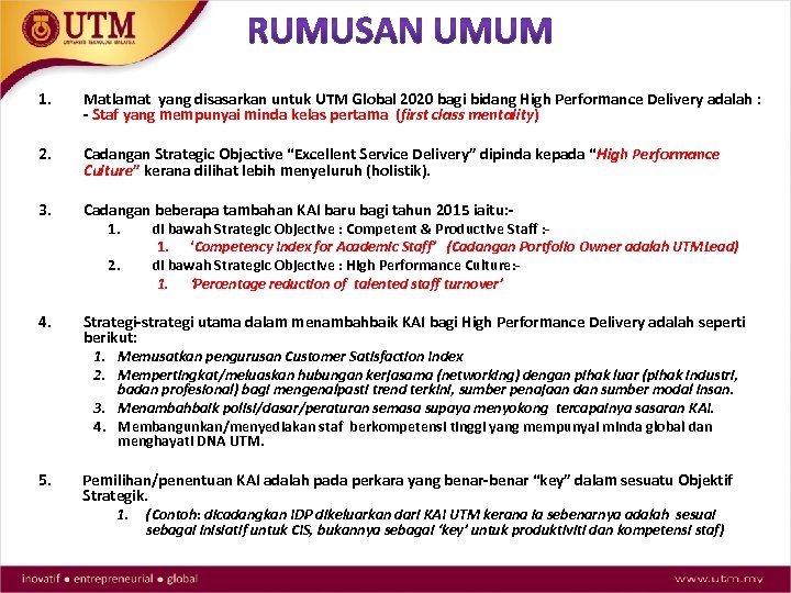 1. Matlamat yang disasarkan untuk UTM Global 2020 bagi bidang High Performance Delivery adalah : - Staf yang mempunyai minda kelas pertama (first class mentality) 2. Cadangan Strategic Objective “Excellent Service Delivery” dipinda kepada “High Performance Culture” kerana dilihat lebih menyeluruh (holistik). 3. Cadangan beberapa tambahan KAI baru bagi tahun 2015 iaitu: 1. di bawah Strategic Objective : Competent & Productive Staff : 1. ‘Competency Index for Academic Staff’ (Cadangan Portfolio Owner adalah UTMLead) 2. di bawah Strategic Objective : High Performance Culture: 1. ‘Percentage reduction of talented staff turnover’ 4. Strategi-strategi utama dalam menambahbaik KAI bagi High Performance Delivery adalah seperti berikut: 1. Memusatkan pengurusan Customer Satisfaction Index 2. Mempertingkat/meluaskan hubungan kerjasama (networking) dengan pihak luar (pihak industri, badan profesional) bagi mengenalpasti trend terkini, sumber penajaan dan sumber modal insan. 3. Menambahbaik polisi/dasar/peraturan semasa supaya menyokong tercapainya sasaran KAI. 4. Membangunkan/menyediakan staf berkompetensi tinggi yang mempunyai minda global dan menghayati DNA UTM. 5. Pemilihan/penentuan KAI adalah pada perkara yang benar-benar “key” dalam sesuatu Objektif Strategik. 1. (Contoh: dicadangkan IDP dikeluarkan dari KAI UTM kerana ia sebenarnya adalah sesuai sebagai inisiatif untuk CIS, bukannya sebagai ‘key’ untuk produktiviti dan kompetensi staf)