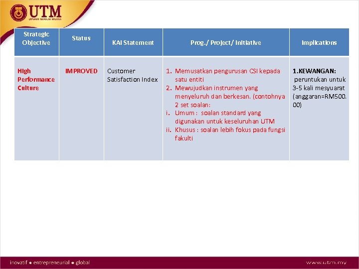 Strategic Objective High Performance Culture Status IMPROVED KAI Statement Prog. / Project/ Initiative Implications Customer Satisfaction Index 1. Memusatkan pengurusan CSI kepada satu entiti 2. Mewujudkan instrumen yang menyeluruh dan berkesan. (contohnya 2 set soalan: i. Umum : soalan standard yang digunakan untuk keseluruhan UTM ii. Khusus : soalan lebih fokus pada fungsi fakulti 1. KEWANGAN: peruntukan untuk 3 -5 kali mesyuarat (anggaran=RM 500. 00)