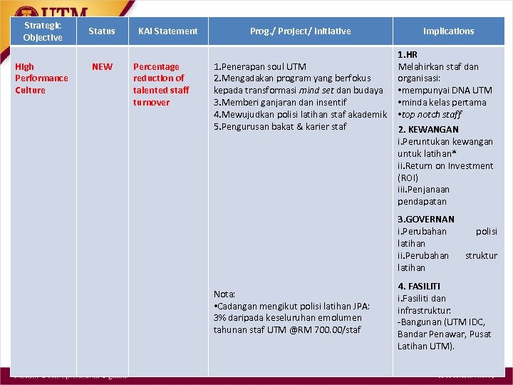 Strategic Objective High Performance Culture Status NEW KAI Statement Percentage reduction of talented staff turnover Prog. / Project/ Initiative 1. Penerapan soul UTM 2. Mengadakan program yang berfokus kepada transformasi mind set dan budaya 3. Memberi ganjaran dan insentif 4. Mewujudkan polisi latihan staf akademik 5. Pengurusan bakat & karier staf Implications 1. HR Melahirkan staf dan organisasi: • mempunyai DNA UTM • minda kelas pertama • top notch staff 2. KEWANGAN i. Peruntukan kewangan untuk latihan* ii. Return on Investment (ROI) iii. Penjanaan pendapatan 3. GOVERNAN i. Perubahan latihan ii. Perubahan latihan Nota: • Cadangan mengikut polisi latihan JPA: 3% daripada keseluruhan emolumen tahunan staf UTM @RM 700. 00/staf polisi struktur 4. FASILITI i. Fasiliti dan infrastruktur: -Bangunan (UTM IDC, Bandar Penawar, Pusat Latihan UTM).