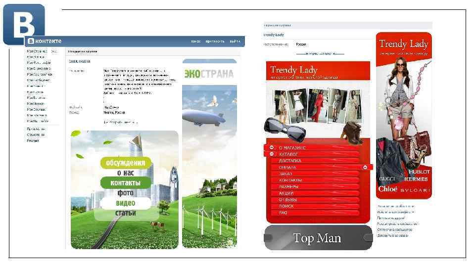 Facebook Вконтакте Сложный интерфейс Простой интерфейс США, Европа СНГ 47% мужчин, 53% женщин Более взрослая аудитория, проф. сообщество Молодёжная аудитория, массовое сообщество Бизнес-формат Развлекательный формат