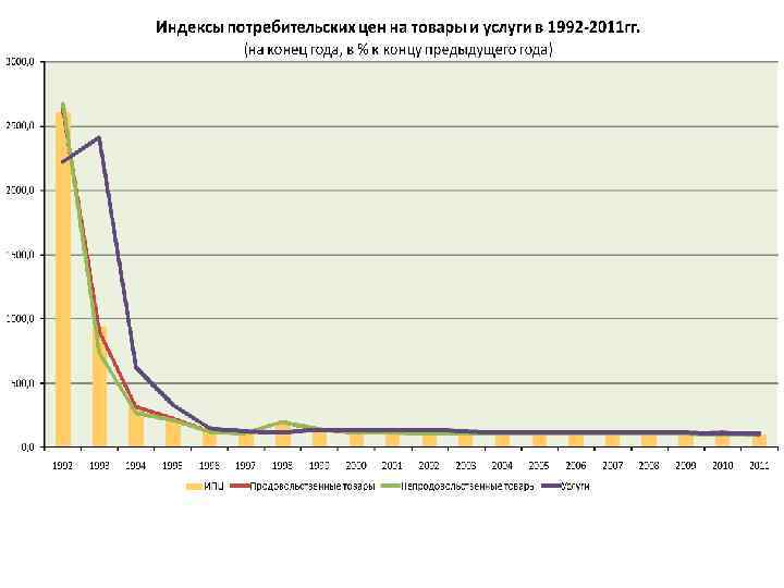 Индексы потребительских цен на товары и услуги в 1992 -2011 гг. на конец года, в % к декабрю предыдущего года Все товары и услуги 1992 1993 1994 1995 1996 1997 1998 1999 2000 2001 2002 2003 2004 2005 2006 2007 2008 2009 2010 2011 2608, 8 939, 9 315, 1 231, 3 121, 8 111, 0 184, 4 136, 5 120, 2 118, 6 115, 1 112, 0 111, 7 110, 9 109, 0 111, 9 113, 3 108, 8 106, 1 в том числе: продовольственные товары непродовольственные товары 2626, 2 904, 9 314, 1 223, 4 117, 7 109, 1 196, 0 135, 9 117, 1 111, 0 110, 2 112, 3 109, 6 108, 7 115, 6 116, 5 106, 1 112, 9 103, 9 2673, 4 741, 8 269, 0 216, 3 117, 8 108, 1 199, 5 139, 2 118, 5 112, 7 110, 9 109, 2 107, 4 106, 0 106, 5 108, 0 109, 7 105, 0 106, 7 услуги 2220, 5 2411, 2 622, 4 332, 2 148, 4 122, 5 118, 3 134, 0 133, 7 136, 9 136, 2 122, 3 117, 7 121, 0 113, 9 113, 3 115, 9 111, 6 108, 1 108, 7