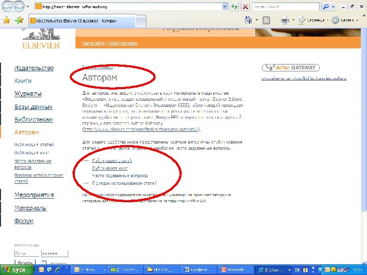 Elsevier Editorial System • Для авторов, желающих опубликовать свои материалы в издательстве «Эльзевир» , создан специальный интерактивный портал Elsevier Editorial System — «Издательская Система Эльзевира» (EES), облегчающий процедуру передачи материалов, отслеживание процесса рассмотрения статьи и взаимодействие с рецензентами. Вход в EES осуществляется со стартовой страницы для Авторов Author Gateway http: //www. elsevier. com/wps/find/authorsview. authors// • представлены краткие алгоритмы опубликования статей и книг, а также, ответы на наиболее часто задаваемые вопросы.