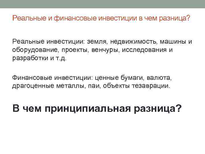Реальные и финансовые инвестиции в чем разница? Реальные инвестиции: земля, недвижимость, машины и оборудование, проекты, венчуры, исследования и разработки и т. д. Финансовые инвестиции: ценные бумаги, валюта, драгоценные металлы, паи, объекты тезаврации. В чем принципиальная разница?