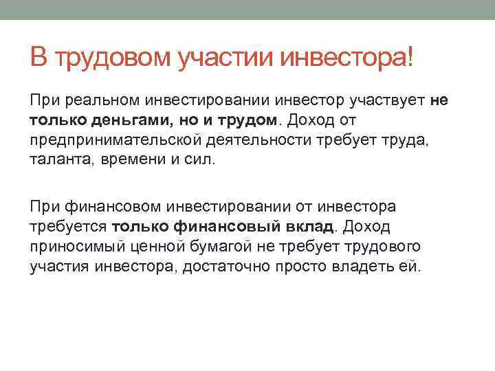 В трудовом участии инвестора! При реальном инвестировании инвестор участвует не только деньгами, но и трудом. Доход от предпринимательской деятельности требует труда, таланта, времени и сил. При финансовом инвестировании от инвестора требуется только финансовый вклад. Доход приносимый ценной бумагой не требует трудового участия инвестора, достаточно просто владеть ей.