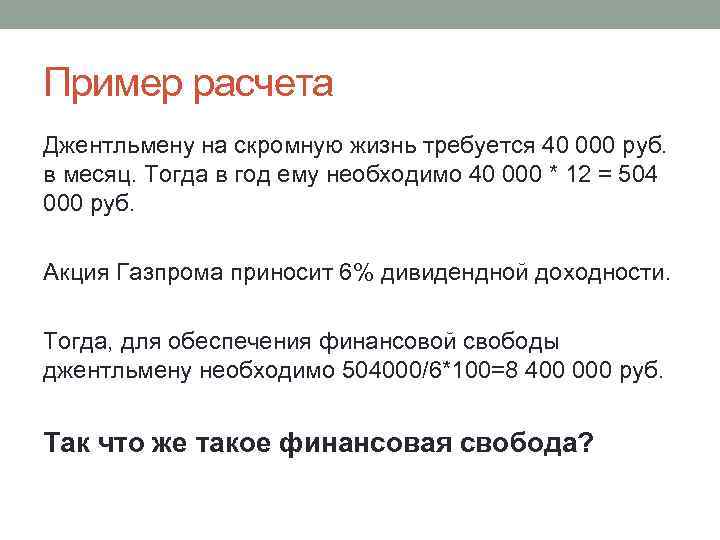 Пример расчета Джентльмену на скромную жизнь требуется 40 000 руб. в месяц. Тогда в год ему необходимо 40 000 * 12 = 504 000 руб. Акция Газпрома приносит 6% дивидендной доходности. Тогда, для обеспечения финансовой свободы джентльмену необходимо 504000/6*100=8 400 000 руб. Так что же такое финансовая свобода?