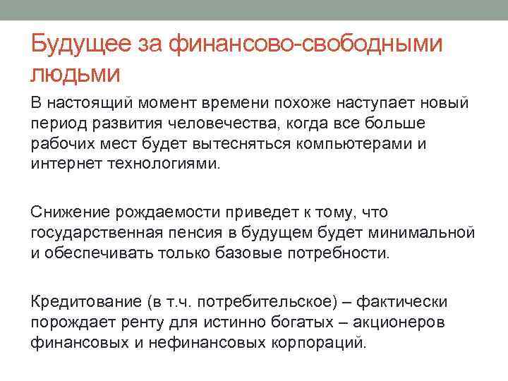 Будущее за финансово-свободными людьми В настоящий момент времени похоже наступает новый период развития человечества, когда все больше рабочих мест будет вытесняться компьютерами и интернет технологиями. Снижение рождаемости приведет к тому, что государственная пенсия в будущем будет минимальной и обеспечивать только базовые потребности. Кредитование (в т. ч. потребительское) – фактически порождает ренту для истинно богатых – акционеров финансовых и нефинансовых корпораций.