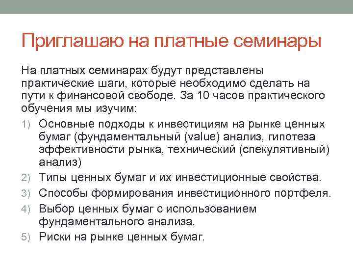 Приглашаю на платные семинары На платных семинарах будут представлены практические шаги, которые необходимо сделать на пути к финансовой свободе. За 10 часов практического обучения мы изучим: 1) Основные подходы к инвестициям на рынке ценных бумаг (фундаментальный (value) анализ, гипотеза эффективности рынка, технический (спекулятивный) анализ) 2) Типы ценных бумаг и их инвестиционные свойства. 3) Способы формирования инвестиционного портфеля. 4) Выбор ценных бумаг с использованием фундаментального анализа. 5) Риски на рынке ценных бумаг.