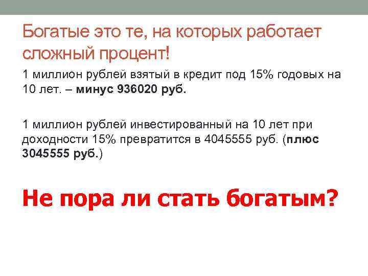 Богатые это те, на которых работает сложный процент! 1 миллион рублей взятый в кредит под 15% годовых на 10 лет. – минус 936020 руб. 1 миллион рублей инвестированный на 10 лет при доходности 15% превратится в 4045555 руб. (плюс 3045555 руб. ) Не пора ли стать богатым?