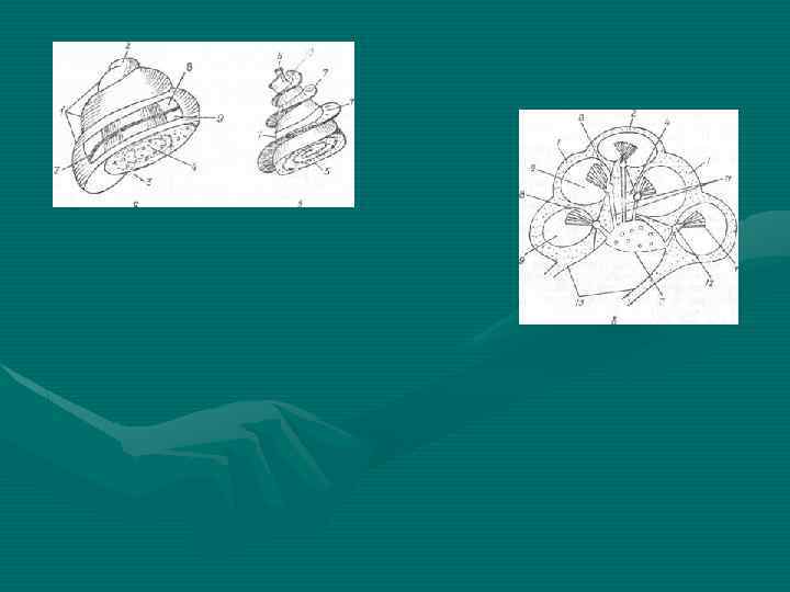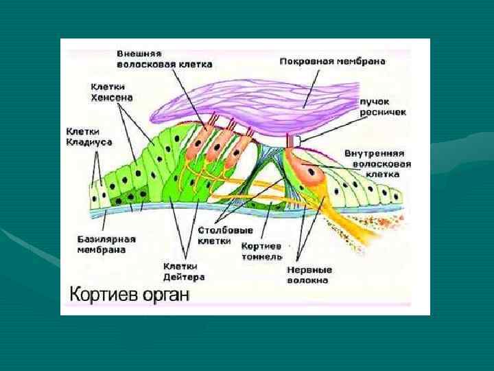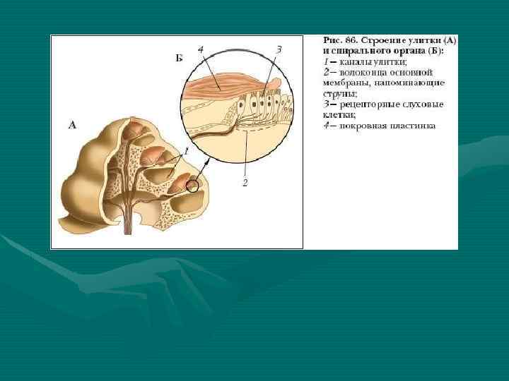 1 — спиральный канал улитки — canalis spiralis ossea cochleae; 2 — стержень — modiolus; 3 — спиральная костная пластинка — lamina spiralis ossea; 4 — узкая полость в спиральной костной пластинке; 5 — спиральный канал стержня — canalis spiralis cochleae; 6 — продольные каналы стержня — canales spirales modiloi; 7 — спиральный узел (Кортиев)—ganglion spirale (Corti); 8 — барабанная стенка (спиральная мембрана)-—paries tympanicus (мембрана spiralis); состоит из соединительнотканных волокон, идет в плоскости и направлении костной спиральной пластинки — lamina spiralis ossea; 9 — спиральный орган (Кортиев орган)—organum spirale (Cortii); воспринимает механические колебания перилимфы лестницы преддверия — scala vestibuli и барабанной лестницы — scala tympani; 10 —преддверная стенка улиткового протока (Рейсснера)— paries vestibularis (membrana vestibularis) (Reissneri); располагается от конца спиральной костной пластинки — lamina spiralis ossea — косо вверх к наружной стенке улиткового протока — ductus cochlearis; 11 — наружная стенка улиткового протока — paries externus ductus cochlearis; срастается с надкостницей наружной стенки спирального канала улитки — canalis spiralis osseus, повторяя его форму; 12 — лестница преддверия — scala vestibuli; заполнена перилимфой; 13 — барабанная лестница — scala tympani; заполнена перилимфой; 14 — полость протока улитки — cavum ductus cochlearis; заполнена эндолимфой — endolympha