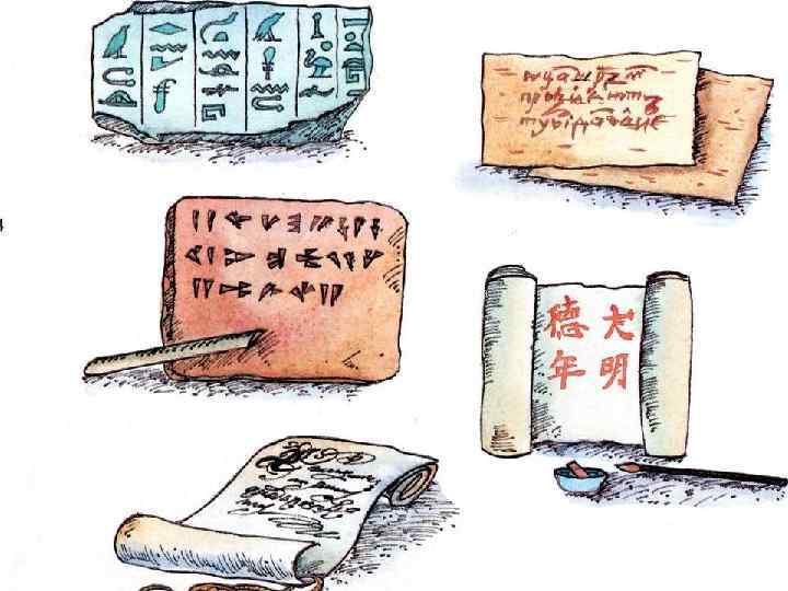 • Глиняные книги – таблички в древней Ассирии. • Папирусные листы в древней Индии. • Пергамент из кожи животных. • Берестяные книги – берестяные грамоты. Наши предки славяне. • И наконец – бумага. II век до нашей эры. Изобрёл китаец Цай Лунь