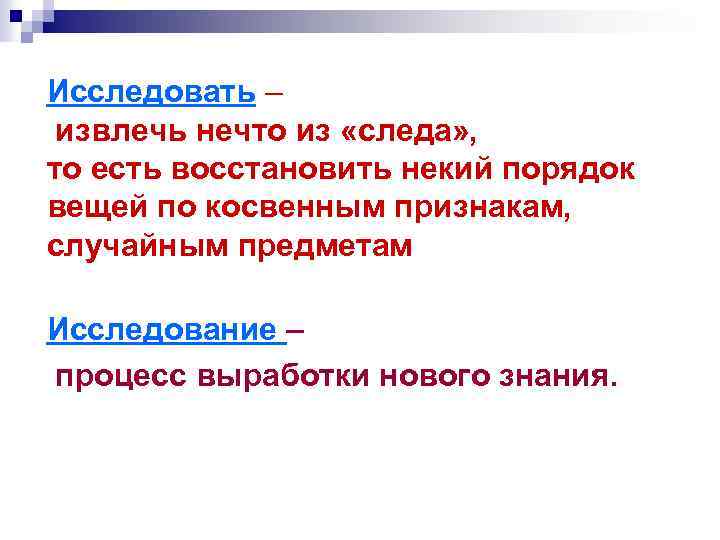 Исследовать – извлечь нечто из «следа» , то есть восстановить некий порядок вещей по косвенным признакам, случайным предметам. . Исследование – процесс выработки нового знания.