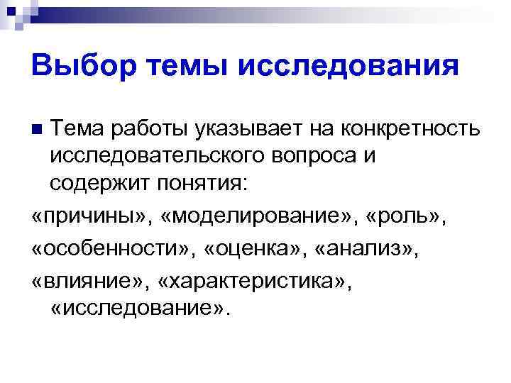 Выбор темы исследования Тема работы указывает на конкретность исследовательского вопроса и содержит понятия: «причины» , «моделирование» , «роль» , «особенности» , «оценка» , «анализ» , «влияние» , «характеристика» , «исследование» . n