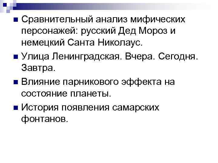 Сравнительный анализ мифических персонажей: русский Дед Мороз и немецкий Санта Николаус. n Улица Ленинградская. Вчера. Сегодня. Завтра. n Влияние парникового эффекта на состояние планеты. n История появления самарских фонтанов. n