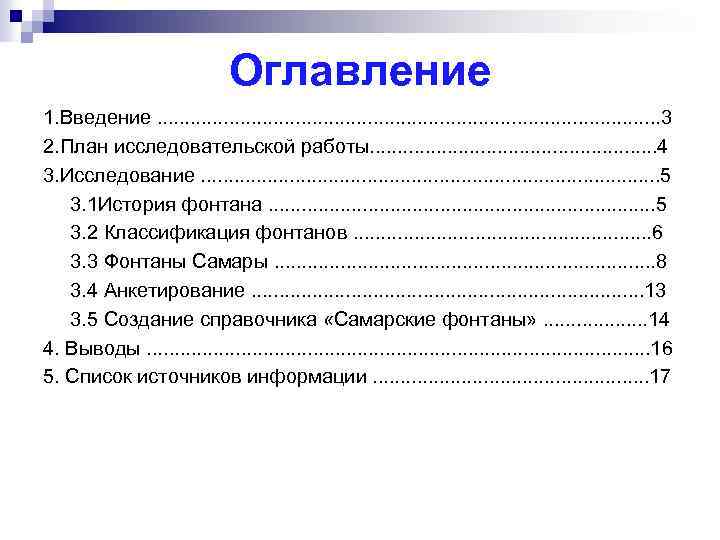 Оглавление 1. Введение. . . . . . 3 2. План исследовательской работы. . . . 4 3. Исследование. . . . . . 5 3. 1 История фонтана. . . . . 5 3. 2 Классификация фонтанов. . . . 6 3. 3 Фонтаны Самары. . . . . 8 3. 4 Анкетирование. . . . . 13 3. 5 Создание справочника «Самарские фонтаны» . . 14 4. Выводы. . . . . . 16 5. Список источников информации. . . 17