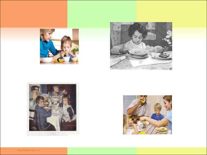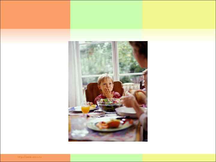 • Если тебе нужно что-нибудь взять, не тянись через стол, а вежливо попроси передать. • Никогда не отзывайся о блюде, которое едят твои соседи. Если ты сам его не любишь, не порть аппетит другим. • Не сиди боком к столу – это некрасиво. • Не кроши хлеб, доедай кусок до конца. Не забывай, сколько людей трудилось, чтобы этот кусочек попал к тебе на стол.