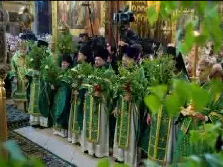 КАК ПРАЗДНУЕТСЯ ТРОИЦА ? v Каждый год праздник выпадает на разные числа, это связано с тем, что проводят его на пятидесятый день после Пасхи. Например, в 2016 году праздник приходился на 19 июня. v В этот день в церквях проводят литургию и торжественную службу (центральное телевидение часто показывает трансляцию из Храма Христа Спасителя). Также принято вспоминать ушедших из жизни родных и близких. Люди верят, что после праздника природа по-настоящему оживает и зарождается новая жизнь. Православные люди в Троицу не работают, а священнослужители облачаются в зеленую одежду – символ новой жизни и цветения.