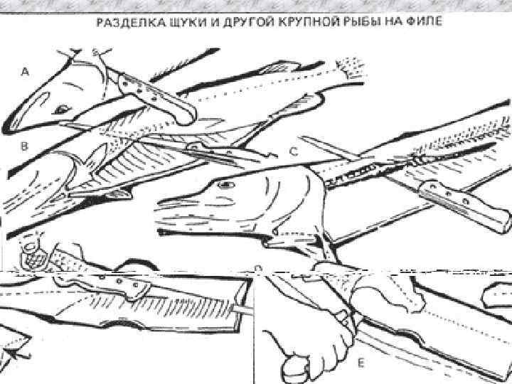 Практические методы разделки рыбы • Каким бы способом вы ни собирались готовить рыбу - целиком, без костей, филе или нарезанную кусочками, - прежде всего её необходимо почистить и разделать. • Рыбу, которая добывается сетью в глубоких водах, потрошат ещё до того, как она доставлена на берег. • Рыба же, пойманная недалеко от берега или в пресных водах, продаётся невыпотрошенной. В большинстве случаев потроха такой рыбы необходимо вынуть, а плавники и чешую - удалить.