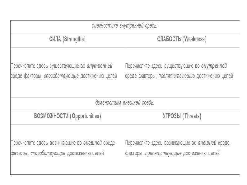 2. Затем вы взвешиваете свои силы и оцениваете рыночную ситуацию, чтобы понять, сможете ли вы двигаться в указанном направлении и каким образом это лучше сделать. SWOT-анализ. 3. Выставляете цели. Причем, они обязательно должны быть максимально конкретными, с точными цифрами и направлениями.