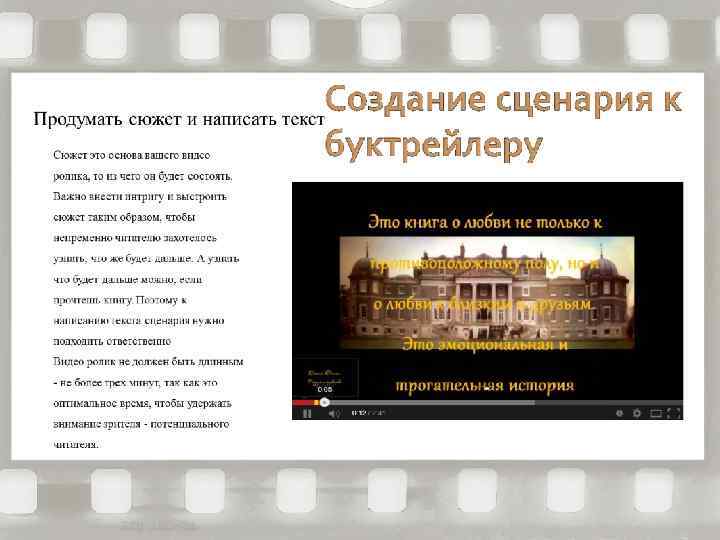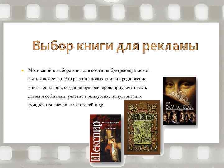 Короткий видеоролик, созданных по мотивам книги. Буктрейлер - это видеореклама книги, в которой работают методы, аналогичные рекламам фильмов. Основная его задача - рассказать о книге, заинтересовать, заинтриговать читателя.