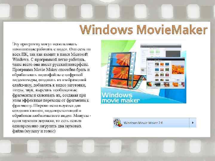 Общее представление об инструментах программы Windows Movie Maker Программа Windows Movie Maker состоит из трех основных частей: - области основных компонентов интерфейса; - раскадровки или шкалы времени; - монитора предварительного просмотра.