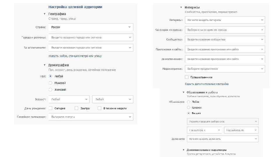 + Показывать посетителям вашего сайта. Показывать конкретным пользователям Вконтакте Исключить тех, кто уже подписан на сообщество Маленькие выборки аудитории