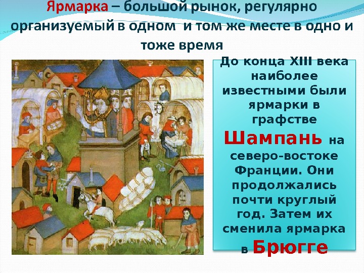 До конца XIII века наиболее известными были ярмарки в графстве Шампань на северо-востоке Франции. Они продолжались почти круглый год. Затем их сменила ярмарка в Брюгге