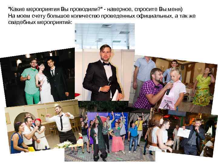 "Какие мероприятия Вы проводили? " - наверное, спросите Вы меня) На моем счету большое количество проведенных официальных, а так же свадебных мероприятий: