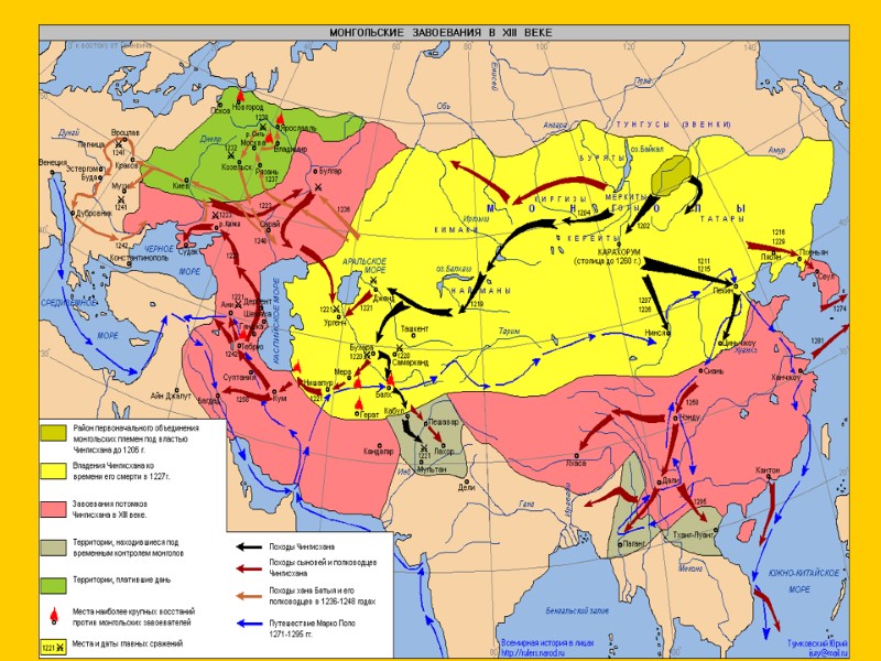 Основные события периода монгольских завоеваний 1211-1215 поход Чингисхана в северный Китай 1219-1223 –завоевание Казахстана и Средней Азии 31 мая 1223- битва на реке Калка 1237-1242 поход Хана Батыя на Русь и Восточную Европу